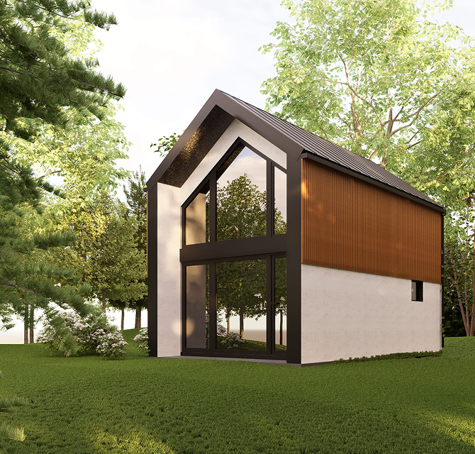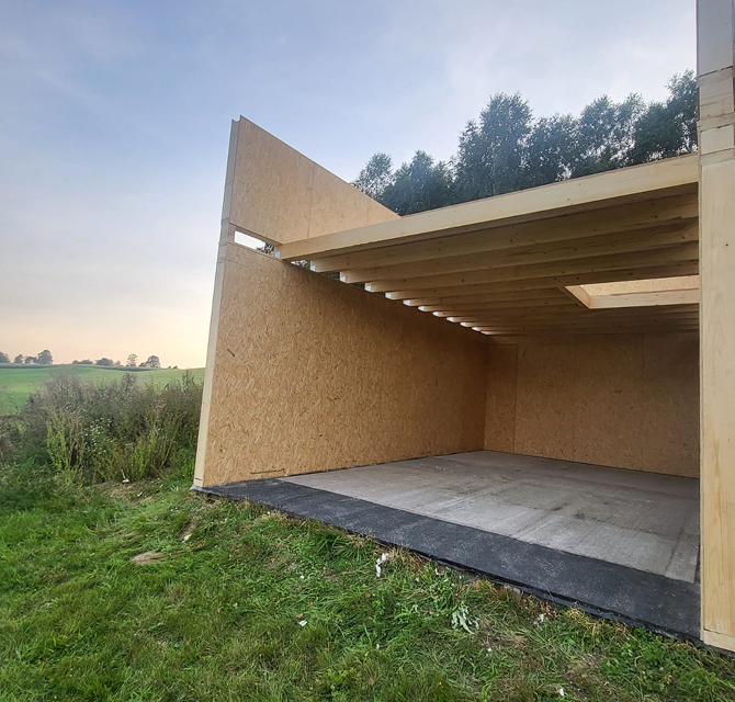 - Konstrukcja domku w całości wykonana jest z certyfikowanego drewna C24 i składa się z prefabrykowanych płyt SIP dociętych na dopasowany wymiar