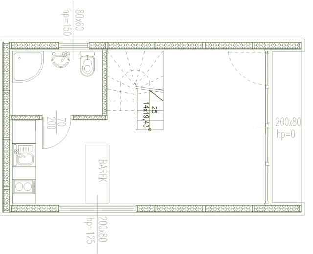 Prezentowany domek to budynek dwukondygnacyjny o powierzchni użytkowej 46,27 m², co zapewnia dużą przestrzeń zarówno na parterze jak i poddaszu. Dom został tak zaprojektowany, że może być przeznaczony do zaspokojenia potrzeb mieszkaniowych. Na parterze zlokalizowano część dzienną domu z salonem połączonym z otwartą kuchnią. Z salonu można przejść również do zlokalizowanej na parterze łazienki. Na piętrze zaprojektowano strefę nocną w skład, której wchodzą dwie sypialnie, które ze względu na swoją dużą kubaturę mogą z powodzeniem pełnić funkcję pokoi dziennych. W domku znajduje się również przestrzenny korytarz.